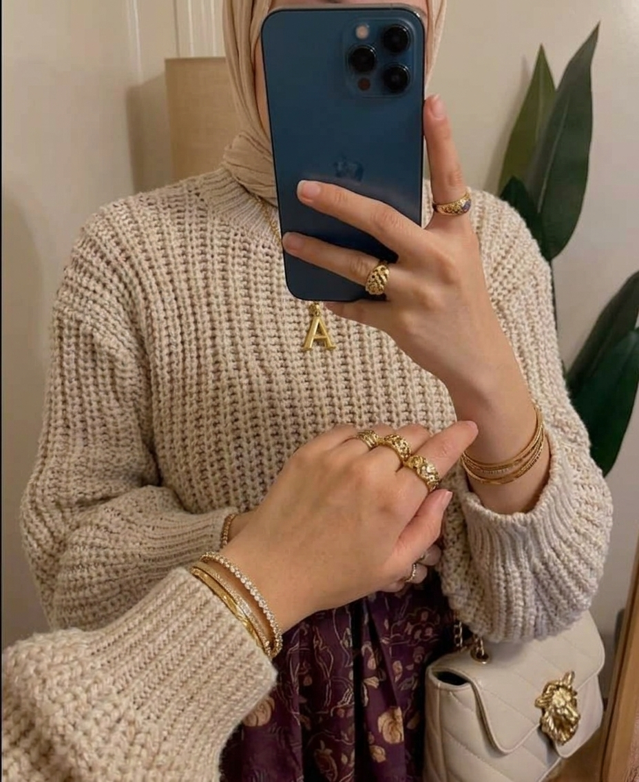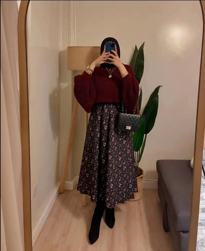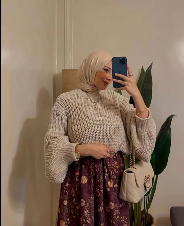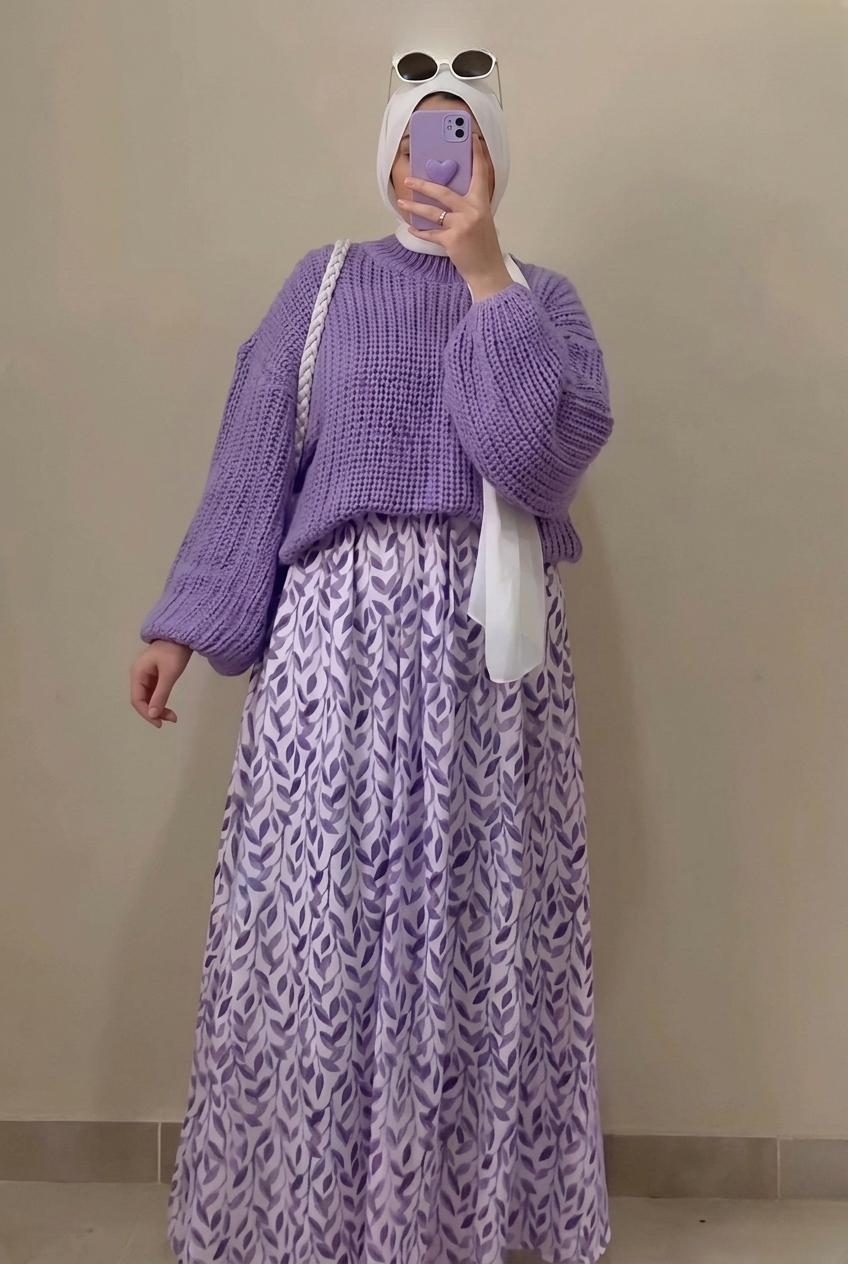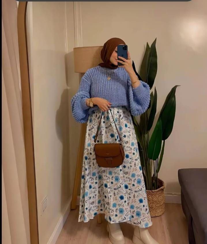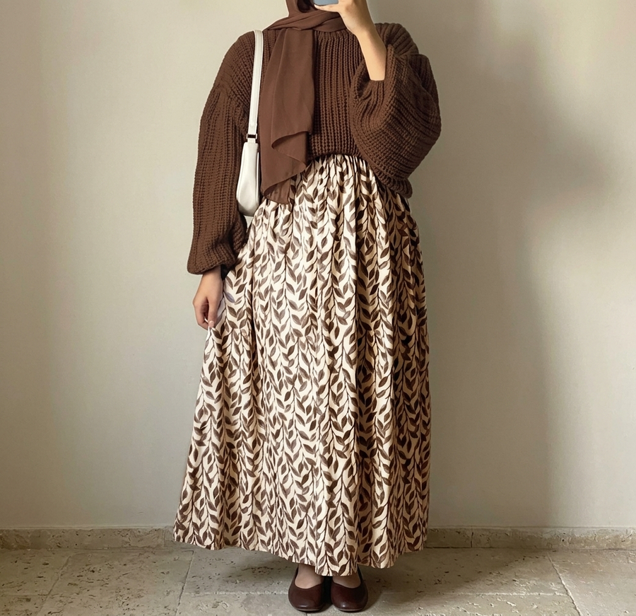الموديل مصمم بقَصّة أڤازيه واسعة في الجيبة تعطي حركة وانسيابية جميلة، مع بلوفر تريكو بأكمام واسعة يضيف لمسة عصرية دافئة.