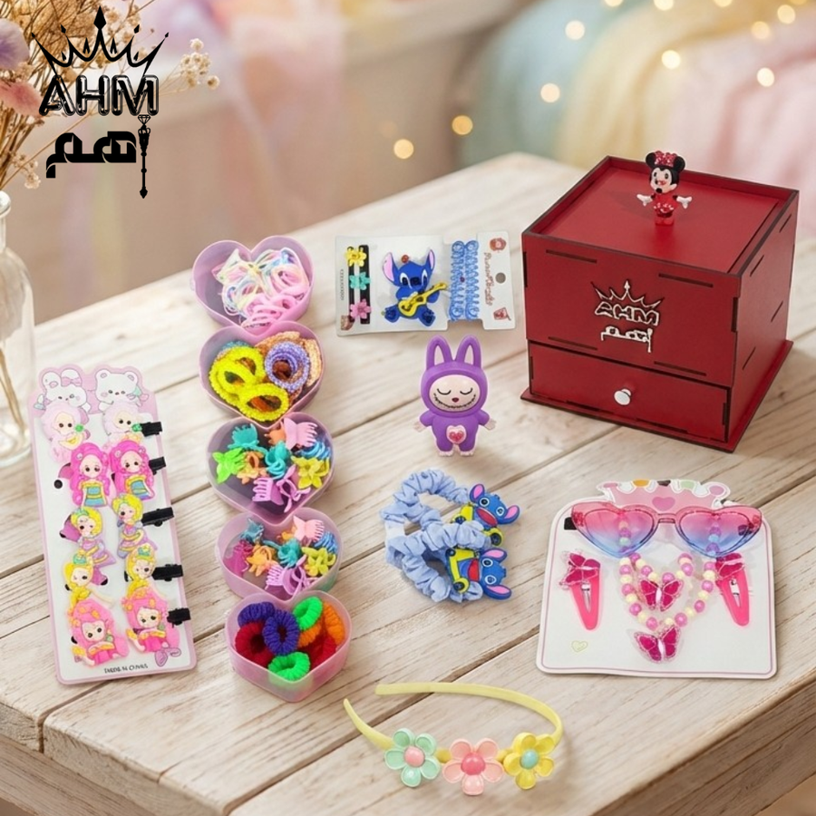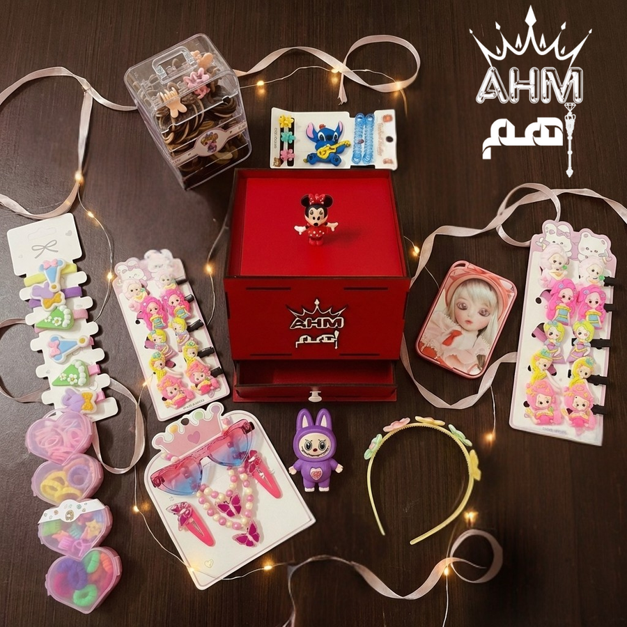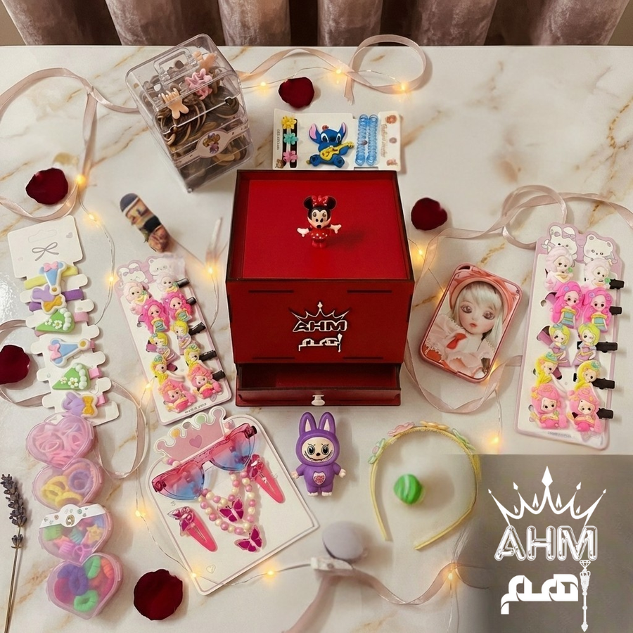 البوكس بييجي بلمسة شخصية خاصة جداً، حيث يوجد حفر ليزر دقيق للاسم مع شعار AHM والتاج الملكي وشخصية ميني ماوس، بإضافة ٥٠ جنية احصلي على كنز أميرتك الآن "باسمها المخصوص" وخليها تلمع زي الملكات 🛍️👑