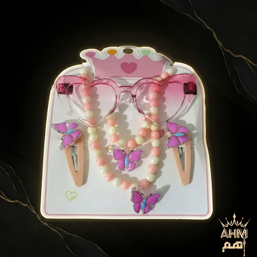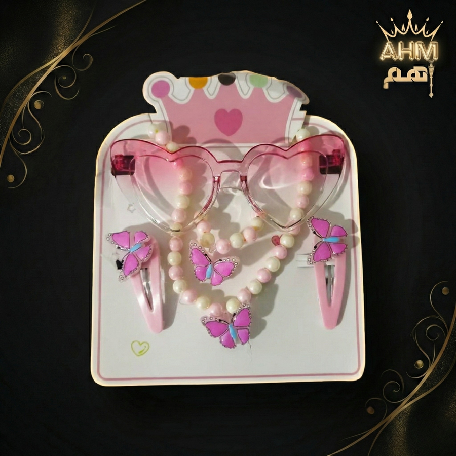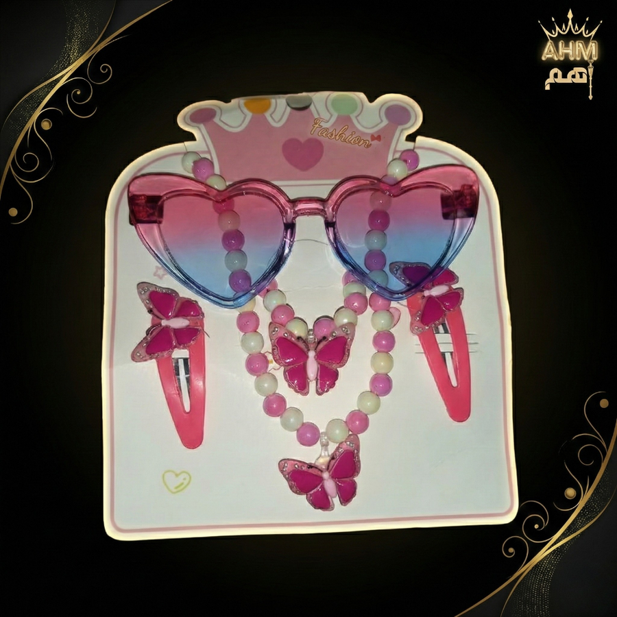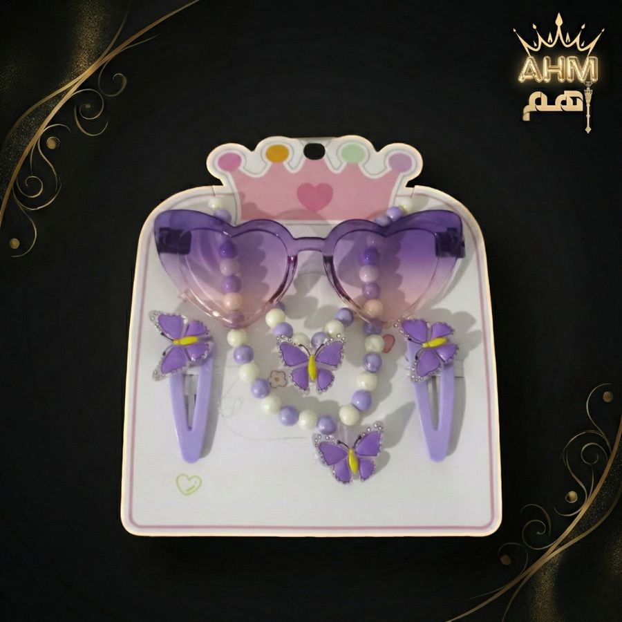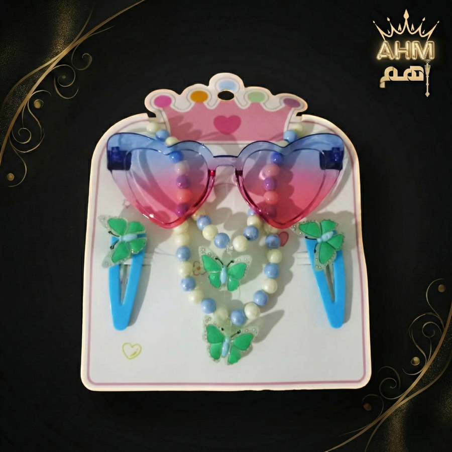 تسوقي طقم نضارة شمس أطفال شكل قلب مع إكسسوارات (سلسلة وتوك فراشة). متوفر بألوان صيفية جذابة (موف، روز، أزرق). حماية وأناقة لطفلتك في الصيف من AHM
